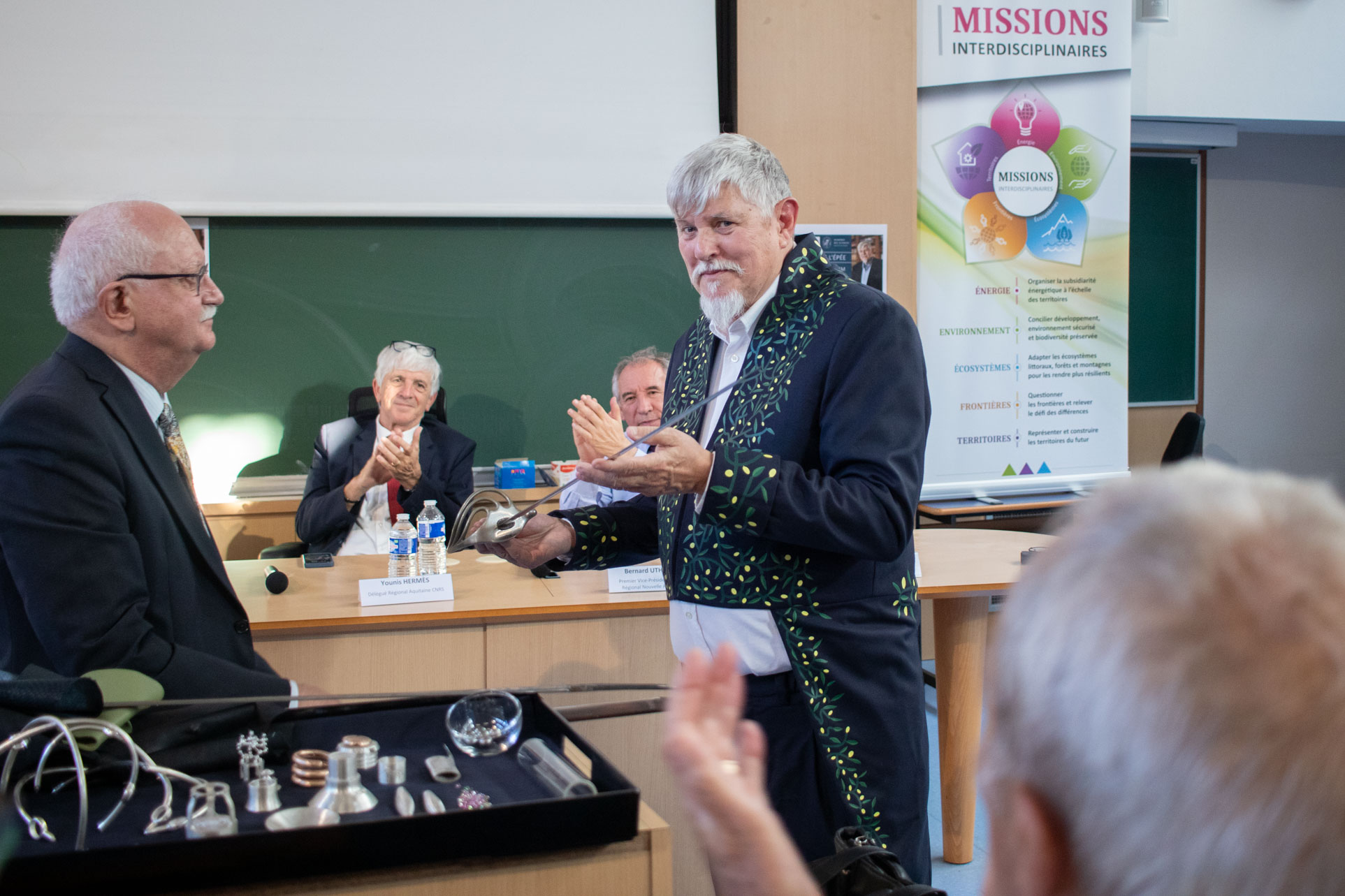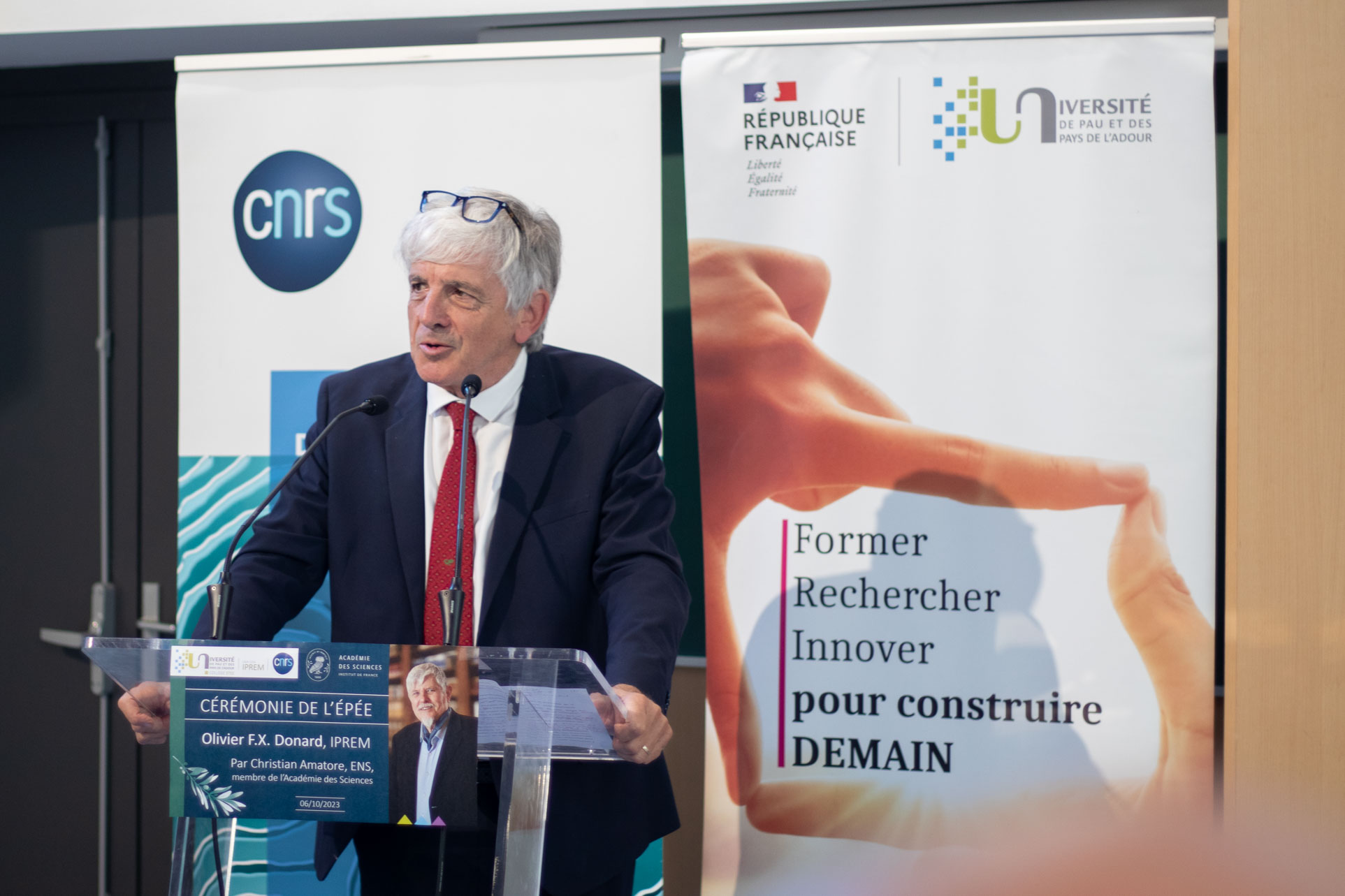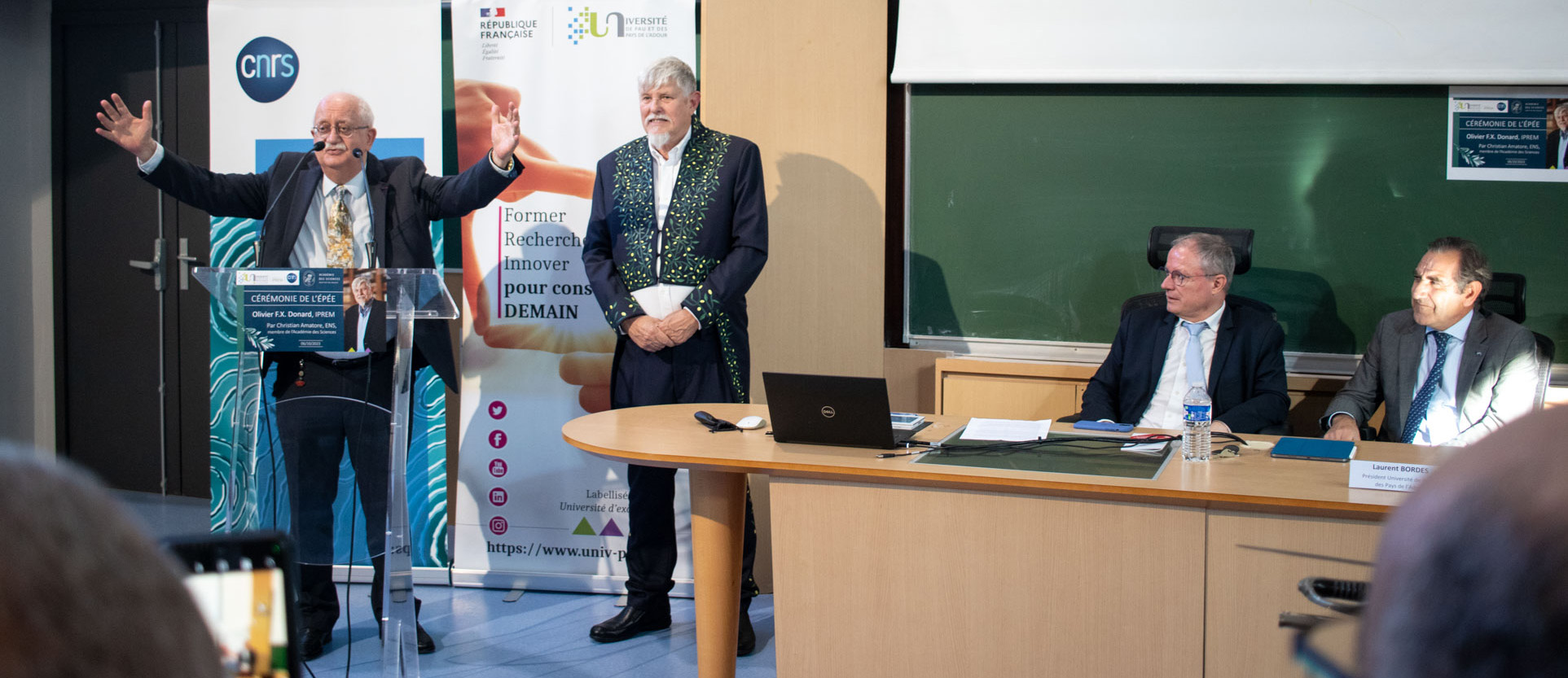 Laurent Bordes, président de l’UPPA, Younis Hermès, délégué régional Aquitaine du CNRS, représentant le président-directeur général Antoine Petit, Bernard Uthurry, premier vice-président du conseil régional de Nouvelle-Aquitaine, représentant le président Alain Rousset, et François Bayrou, président de la communauté d’agglomération Pau Béarn Pyrénées et maire de Pau, ont tour à tour salué la riche carrière du physico-chimiste originaire de Bordeaux et au parcours atypique.