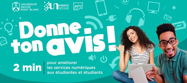 L'université de Pau et des Pays de l'Adour et l'université Savoie Mont Blanc s'implique conjointement pour améliorer les services numériques qui sont proposés à ses étudiantes et étudiants. C'est pourquoi vos réponses sont très utiles et nous aideront à proposer des outils numériques pour contribuer à l’amélioration de vos conditions de vie et d’études.
