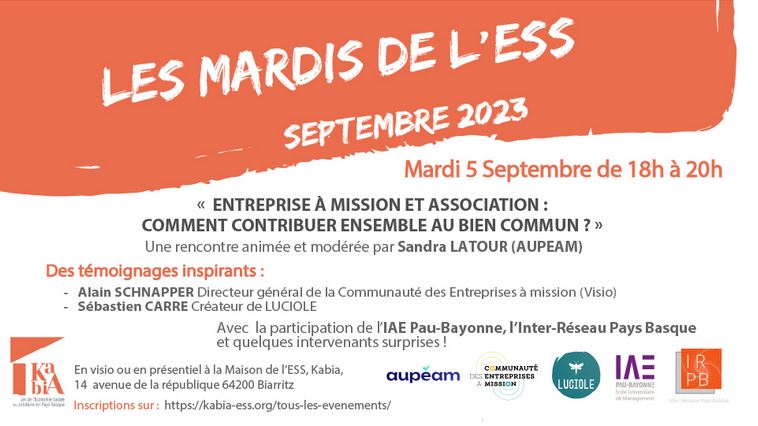 KABIA, Maison de l'ESS, Economie sociale et solidaire en Pays Basque, en partenariat avec l'IAE Pau-Bayonne organise Mardi 5 septembre à 18h une conférence sur le thème : "Entreprise à mission et Association : Comment contribuer ensemble au bien commun?"