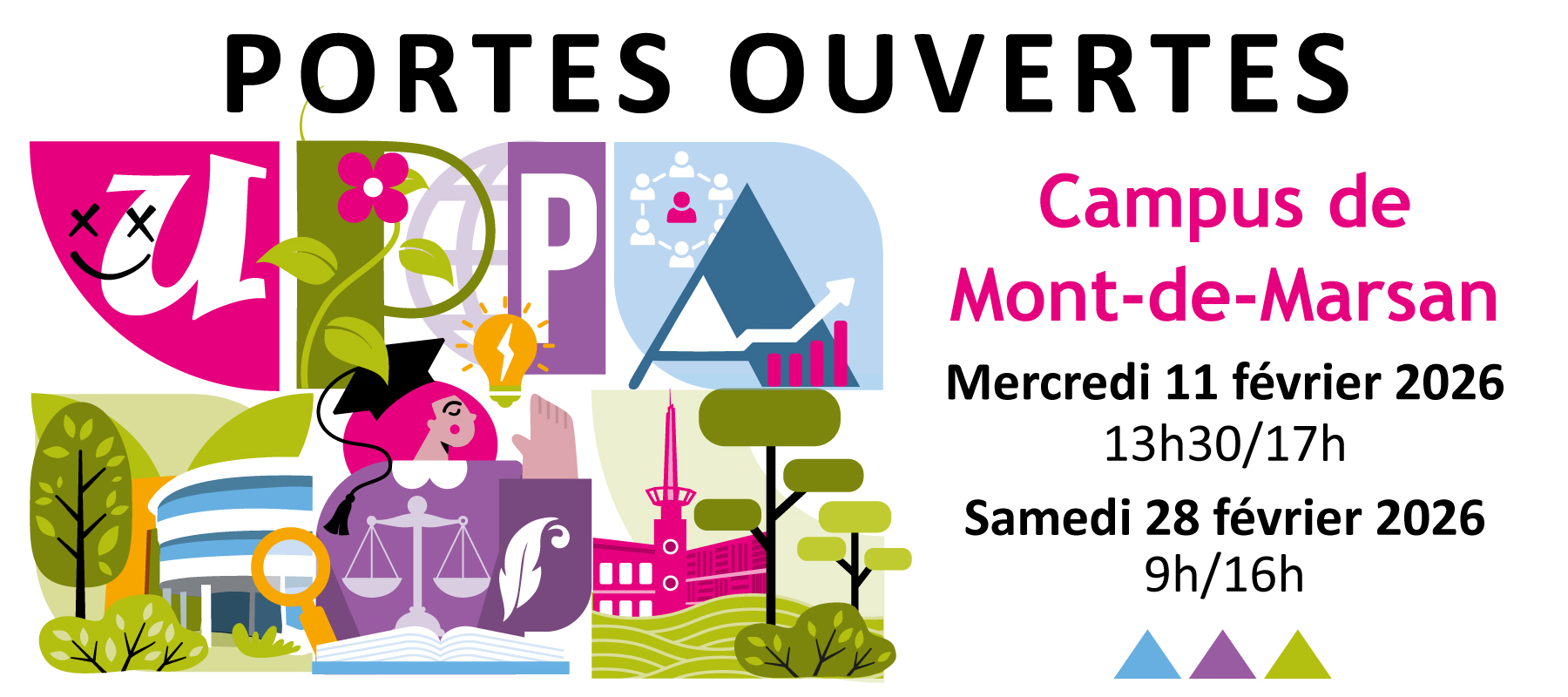 Participez aux portes ouvertes sur le campus de Mont-de-Marsan le mercredi 11 mars 2026, de 13h00 à 17h00, et rencontrez des enseignants, des enseignants-chercheurs, des étudiants et des animateurs de la vie étudiante, visitez des locaux et assistez à une présentation des diplômes.