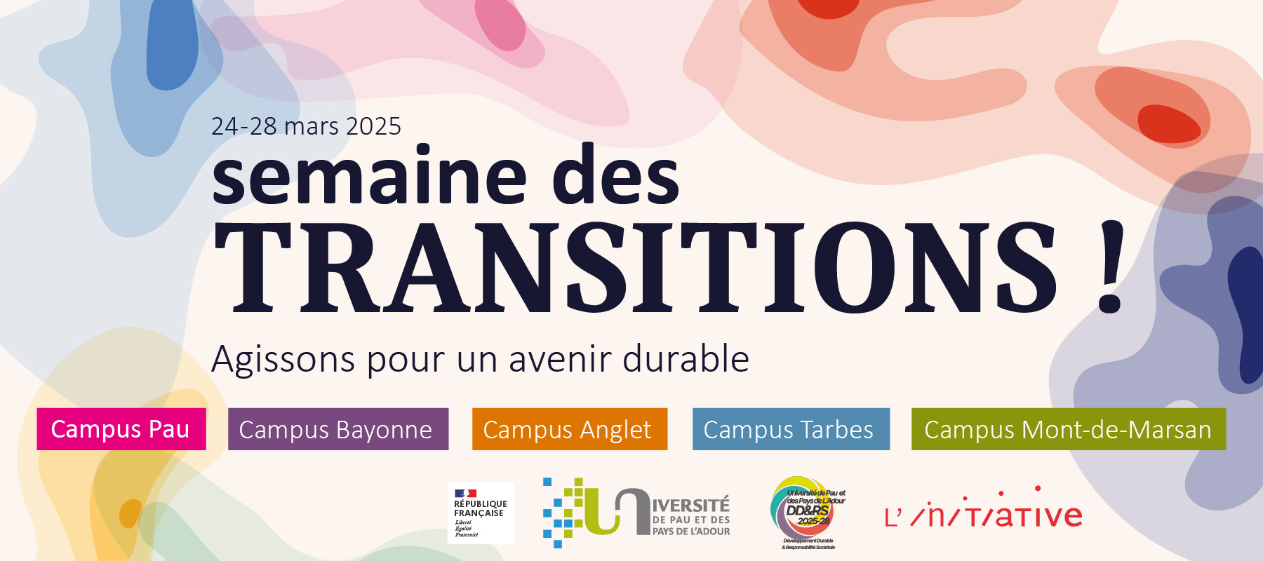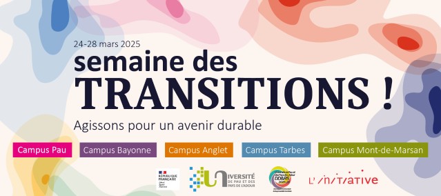 Du 24 au 28 mars 2025, l'Université de Pau et des Pays de l'Adour organise la Semaine des transitions sur chacun de ses cinq campus. Un programme riche en évènements pour explorer les enjeux environnementaux, sociétaux et économiques de notre époque.