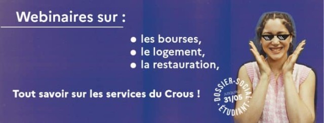 Les webinaires du Crous pour la campagne bourses/logementRendez-vous en ligne entre 14h00 et 15h00 le 16 avril, le 22 avril ou le 24 avril