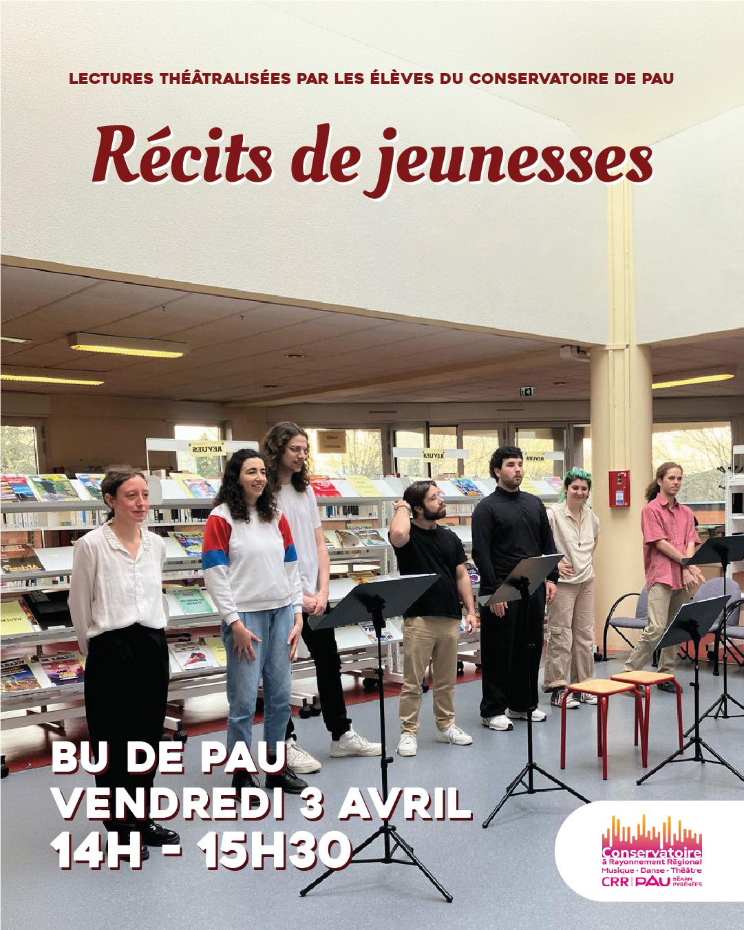 Les élèves du cycle 3 du Diplôme d’Études Théâtrales (DET) du Conservatoire à Rayonnement Régional Pau Béarn Pyrénées vous invitent à découvrir "Récits de jeunesses", série de textes, pour la plupart inédits, d'autrices et d'auteurs offrant des paroles vives et engagées sur le monde d'aujourd'hui. Ces lectures seront suivies d'un temps d'échange avec le public.
